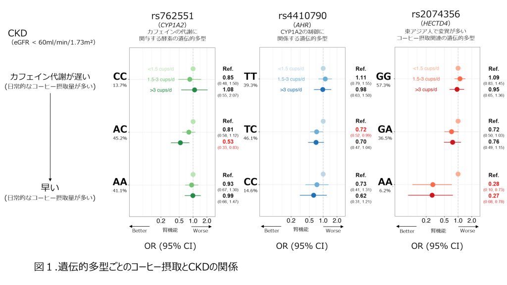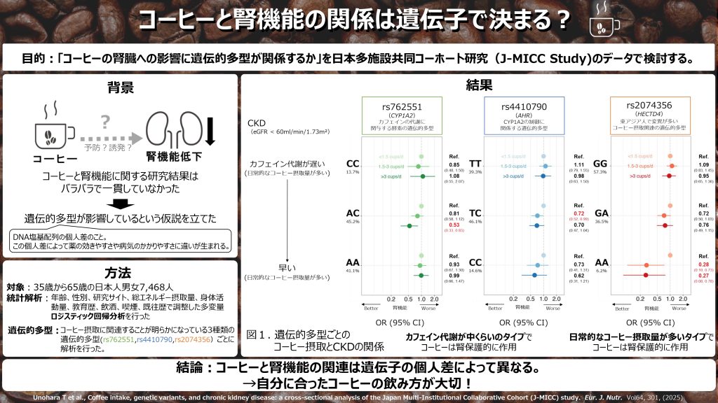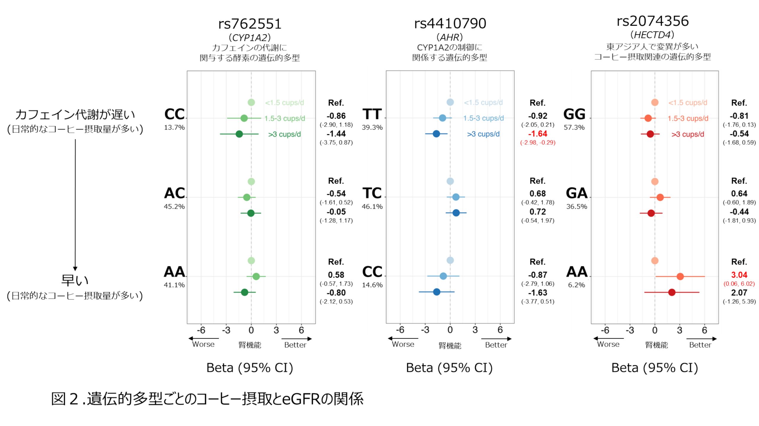 本研究の結果から、コーヒーと腎機能の関係には、コーヒー摂取行動やカフェイン代謝に関連する遺伝的多型が影響することが示唆されました。