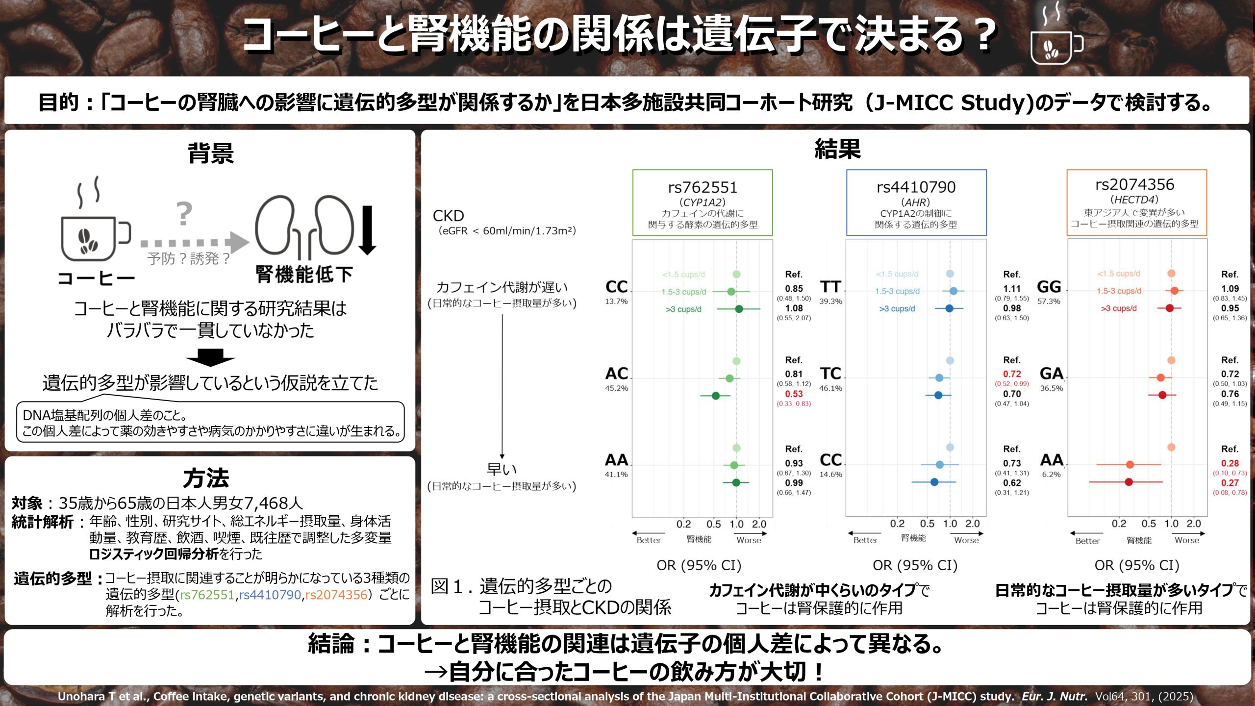 - Unohara T, Fujii R, Watanabe T, Matsuura A, Torii Y, Kita K, Ishizu M, Hara M, Nishida Y, Nagayoshi M, Matsunaga T, Okada R, Kubo Y, Tanoue S, Hidaka Y, Nishiyama T, Nakagawa-Senda H, Koyama T, Watanabe I, Kuriki K, Takashima N, Kondo K, Nakatochi M, Momozawa Y, Tamura T, Matsuo K; J.-MICC Study group. Coffee intake, genetic variants, and chronic kidney disease: a cross-sectional analysis of the Japan Multi-Institutional Collaborative Cohort (J-MICC) study. Eur J Nutr. 2025 Oct 15;64(7):301.