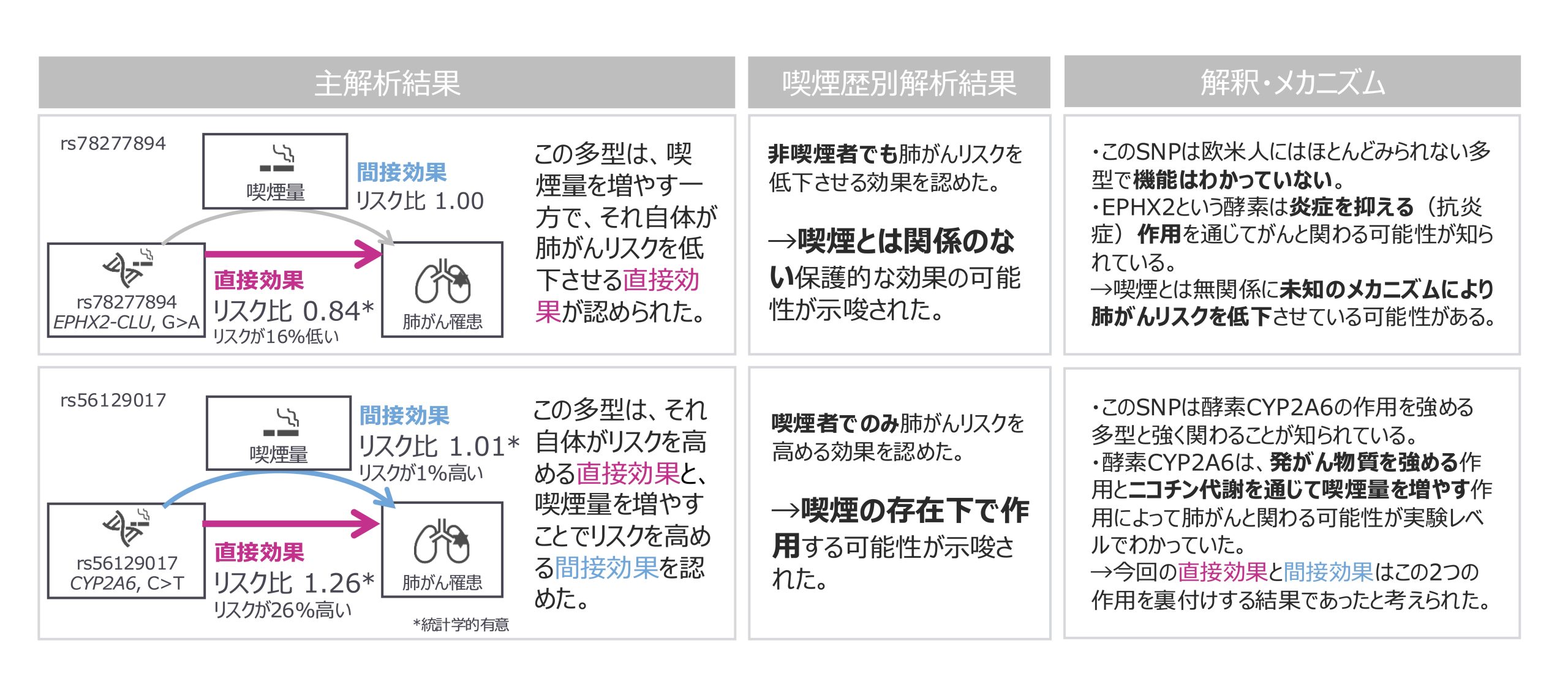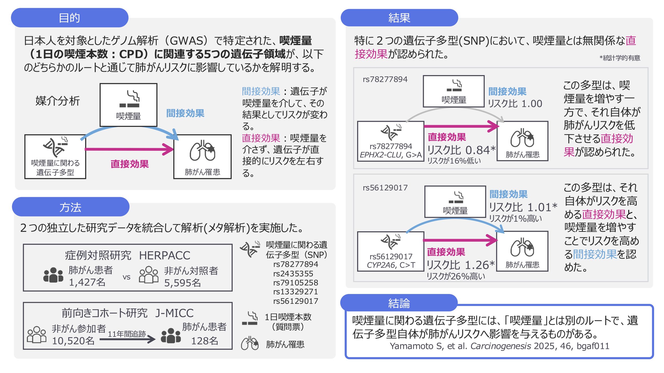 なお、これら2つの遺伝子多型による直接効果は、食道がんや胃がんなど他の喫煙関連がんでは明確な影響を示さず、肺がんに比較的特有な影響であることもわかりました。