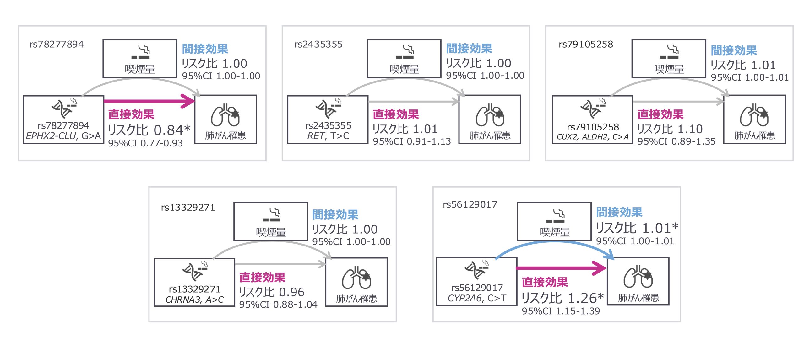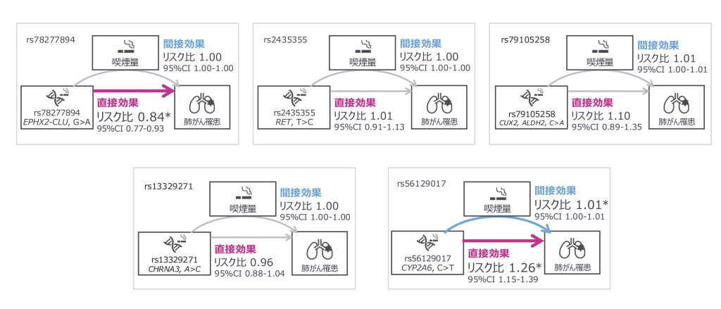 図1は、媒介分析により、5つの遺伝子多型が肺がんリスクに与える影響を示した結果です。